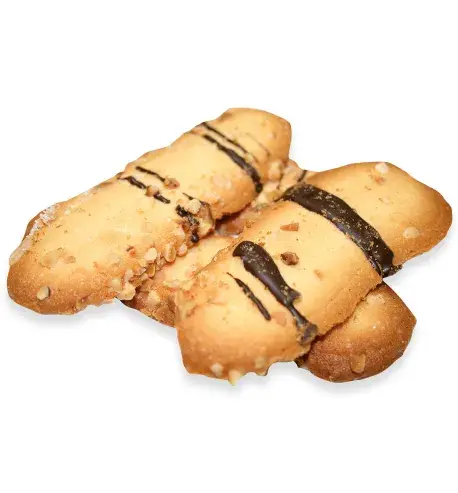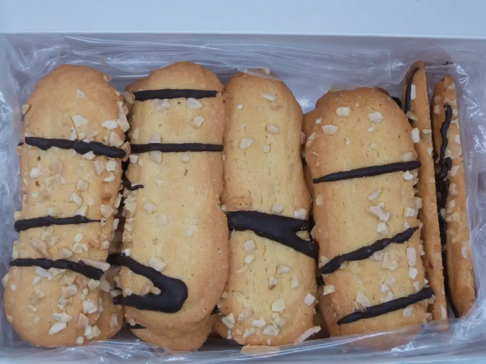 Las Lenguas de Gato son un clásico de nuestra repostería artesanal. Cada pieza es escudillada a mano con manga pastelera, elaborada con harina de trigo, mantequilla, azúcar molido, huevos, azúcar en grano, granillo de almendra y chocolate, y decorada cuidadosamente con tiras de chocolate y almendra.